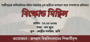 তারিফুল ইসলাম তারিফ : গাজীপুরের মৌচাকে হিন্দু ধর্মাবলম্বী জয় কুমার দাস ও তার সহযোগীদের হাতে এক মাদ্রাসা ছাত্রী গণধর্ষণের শিকার হওয়ার প্রতিবাদে জগন্নাথ বিশ্ববিদ্যালয়ের (জবি) শিক্ষার্থীরা ধর্ষকদের ফাঁসির দাবিতে বিক্ষোভ মিছিল করেছে।
