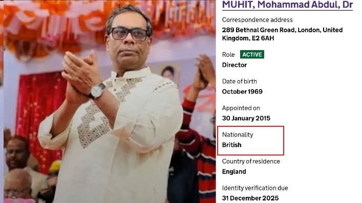 অনুসন্ধানে দেখা গেছে, যুক্তরাজ্যের ব্যবসায়িক নিবন্ধন সংক্রান্ত সরকারি দপ্তর ‘কোম্পানি হাউজ’ (Companies House)-এ এম এ মুহিতের নামে নিবন্ধিত একাধিক প্রতিষ্ঠানের তথ্য রয়েছে। সেখানে নাগরিকত্বের ঘরে স্পষ্টাক্ষরে ‘ব্রিটিশ’ (British) উল্লেখ করা হয়েছে। বাংলাদেশের সংবিধান ও গণপ্রতিনিধিত্ব আদেশ (RPO) অনুযায়ী, কোনো বিদেশি নাগরিক বা অন্য কোনো দেশের প্রতি আনুগত্য স্বীকারকারী ব্যক্তির জাতীয় নির্বাচনে অংশগ্রহণের সুযোগ নেই।
